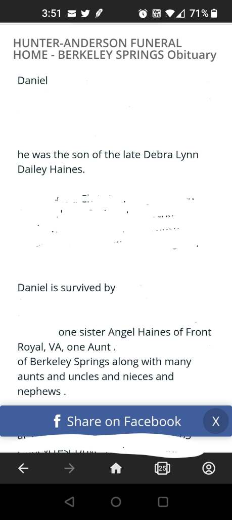 I have removed a great deal of this easily found obituary of her actual brother, it lists her mother by name, and very clearly stated that she was Danny’s only sibling.