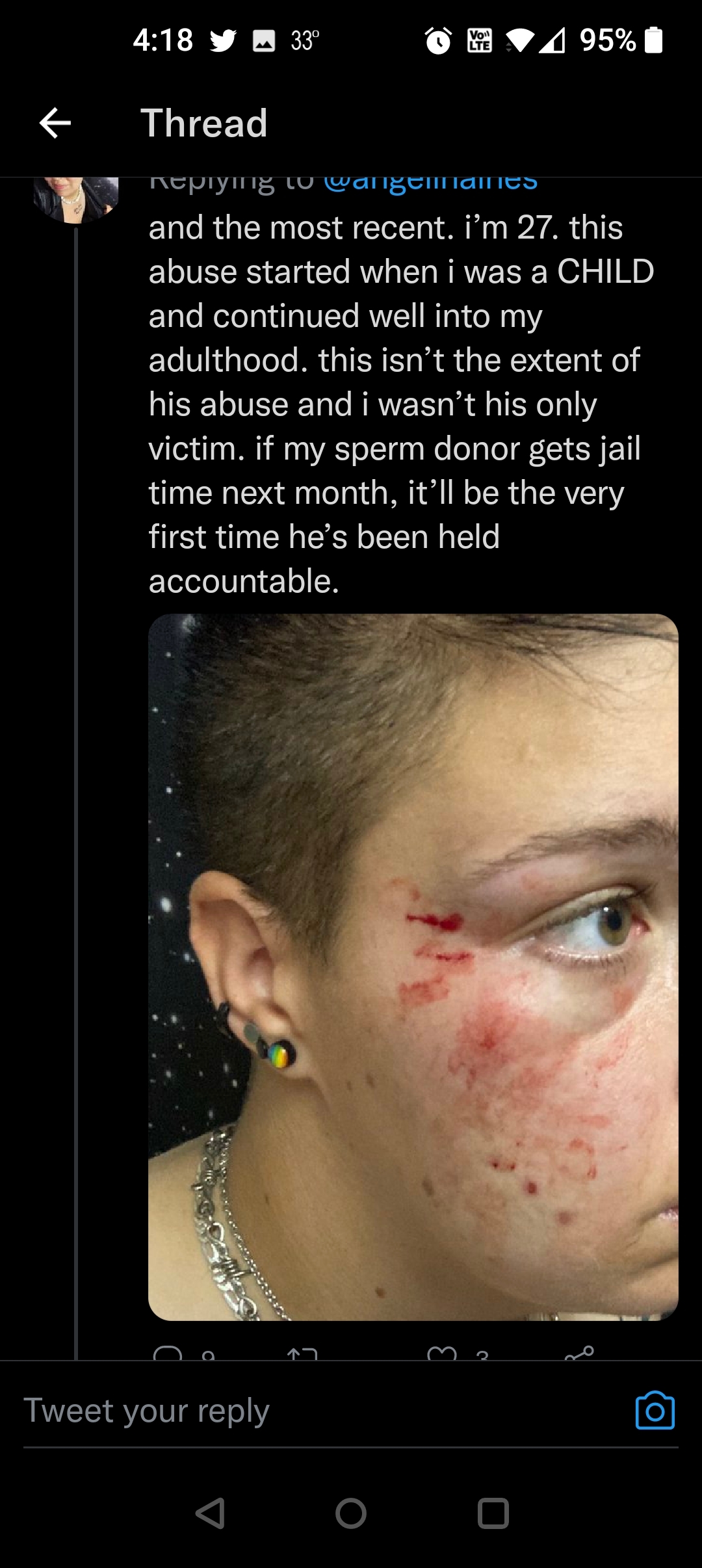 Anyway back to her ex…Angel says it was her ex that shared the tweet about the phone call with her dad. Her sharing this tweet with him was the reason he came to her apartment to beat her up.